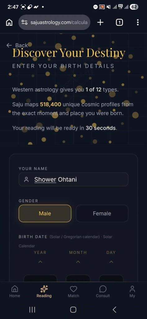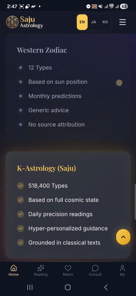 Unlike Western astrology’s 12 zodiac signs, Saju uses your exact birth year, month, day, and hour to generate a profile from 518,400 unique combinations. That’s not a typo — over half a million distinct destiny codes, compared to 12 sun signs.