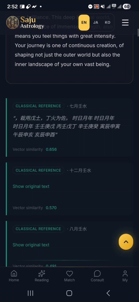 Our system references 562 passages from five foundational Myeongnihak texts — Jeokcheonsu (적천수), Gungtongam (궁통감), Jappyeongjinjeon (잡평진전), Yeonhaejappyeong (연해잡평), and Gyeokguknon (격국론) — encoded as 1,536-dimensional vectors for precise retrieval. - Dual AI Cross-Verification